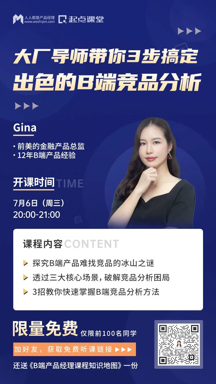 特邀前美的金融产品总监@Gina老师,用1小时教给你一套有效的B端产品竞品分析方法,帮助你解决B端产品竞品分析难题,更有在线1V1互动答疑的机会等你来!
