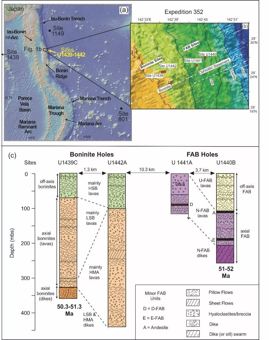 图1 IODP 352航次(U1439-1442)钻位及火成岩柱状图。弧前玄武岩(FAB)和玻安岩根据岩性、产状、形成时代和地球化学特征被分别划分为脊轴(axial)和离轴(off-axis)系列。