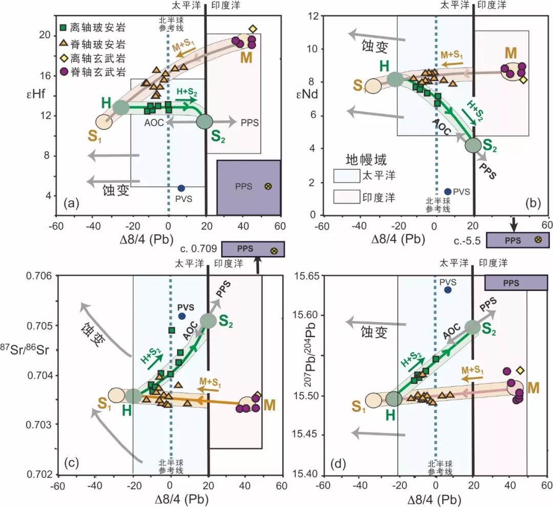 图3 IODP 352航次玄武岩和玻安岩之多元同位素成因解释图解。Δ8/4 (Pb) 是在208Pb/204Pb-206Pb/204Pb投图中相对北半球参考线的偏离程度,印度洋型地幔以Δ8/4>20区别于太平洋型地幔。M:弧前玄武岩地幔;S1:俯冲板块角闪岩相熔体成分;H:熔体交代的弧前玄武岩残留地幔;S2:沉积物+蚀变洋壳流体成分; PPS: 太平洋远洋沉积物; AOC: 蚀变洋壳。