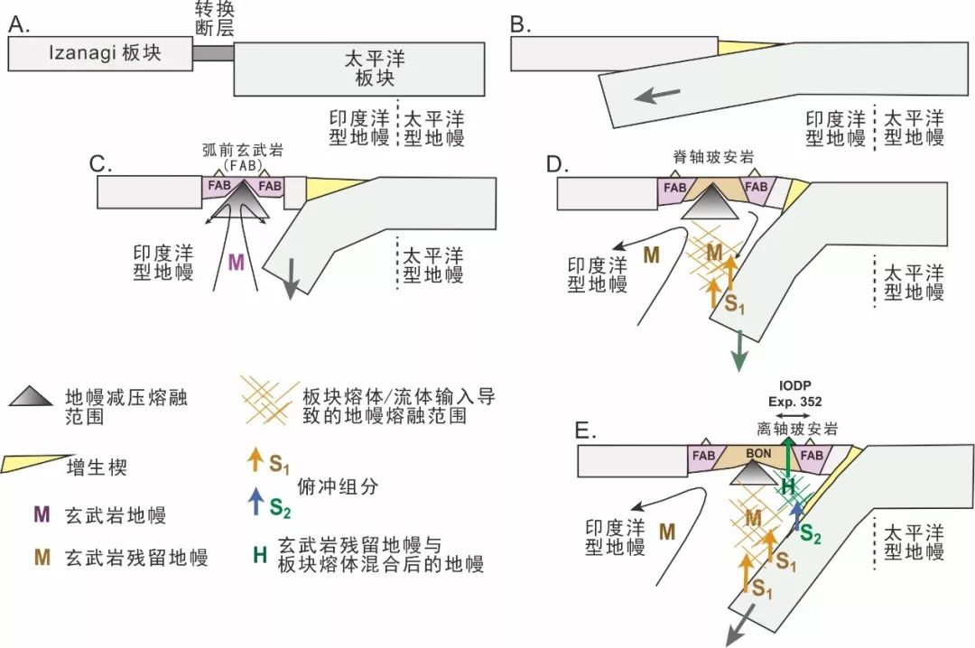 在充分考虑弧前玄武岩源区无明显的俯冲组分、初始俯冲板块经历了角闪岩相熔融以及沉积物仅贡献于晚期离轴玻安岩等观察事实的基础之上,提出了西太平洋板块起始俯冲的新模型 (图4):A) 起始俯冲发生于Izanagi板块和太平洋板块之间的转换断层;B) 慢速、低角度的起始俯冲导致弧前形成沉积物增生楔;C) 当初始俯冲板块深达榴辉岩相时发生相变而快速下沉和后撤,导致弧前地幔强烈减压熔融形成弧前玄武岩;D) 伴随着俯冲板块的进一步下沉,洋壳表面被迅速加热发生角闪岩相熔融,熔体交代地幔楔并促使其熔融形成脊轴低硅玻安岩 (M+S1);E) 伴随着俯冲板块的持续下沉和后撤,侧向俯冲成型,被增生的沉积物进入地幔,释放流体导致地幔楔发生进一步熔融形成离轴高硅玻安岩 (H+S2)。