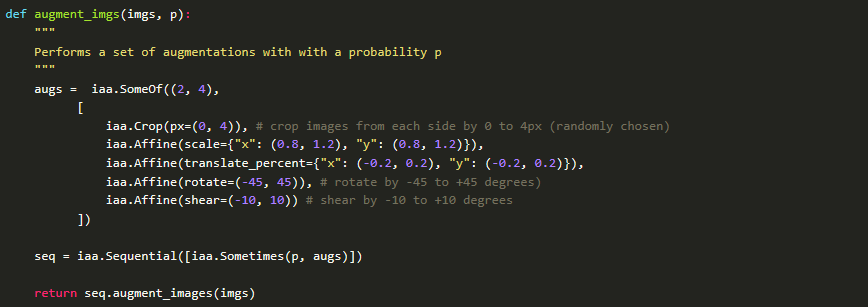 我们使用了一个名为imgaug的库来创建扩展数据。我们主要应用仿射变换来增强图像。代码如下: