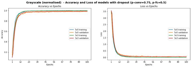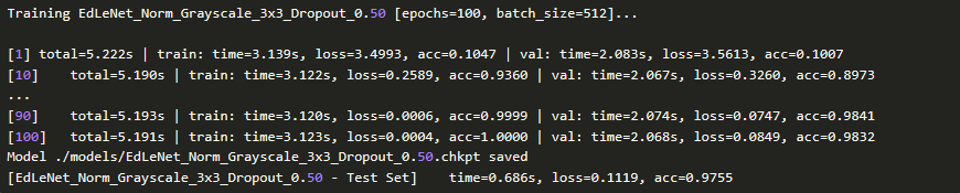 我们尝试过不同的参数,但最终结果是_p-conv = 0.75_和_p-fc = 0.5_,这使得我们可以使用3x3的模型在归一化灰度图上实现97.55%的测试集准确率。有趣的是,我们在验证集上的准确率达到了98.3%以上: