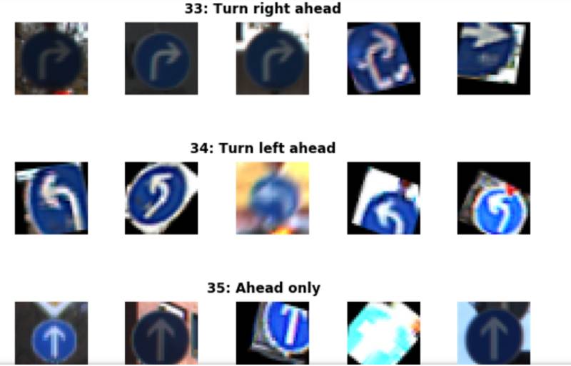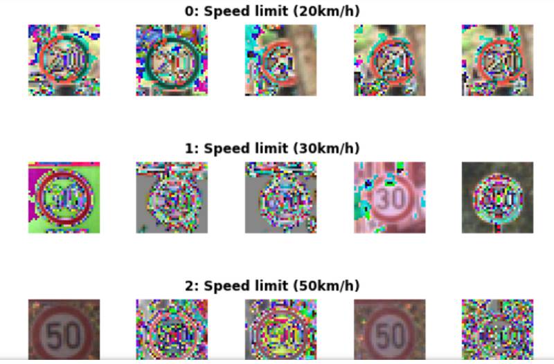 我们在早些时候曾经发现,43个种类的数据明显不平衡。然而,它似乎并不是一个棘手的问题,因为即使这样,我们也能够达到非常高的准确度。我们也注意到测试集中有一些图像是失真的。因此,我们将使用数据增强技术来尝试: