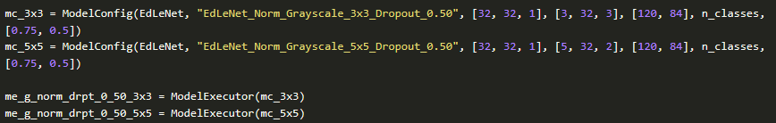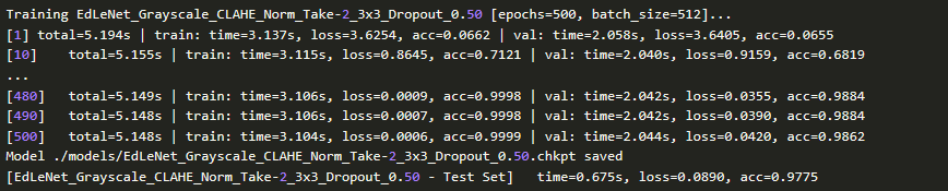 该网络由3个卷积层组成,内核大小为3x3,下一层的深度加倍,使用ReLU作为激活函数,每一层的后面是最大2×2的池操作。最后3层完全连接,最后一层能产生43个结果(可能的标签总数),使用SoftMax作为激活函数。这个网络使用附带Adam优化器的迷你批次随机梯度下降算法进行训练。我们编写了高度模块化的基础代码,这使得我们能够_动态_创建模型,示例代码片段如下: