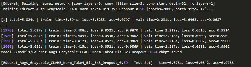 图像的分布当然不会发生显著的变化,但是我们确实对图像应用了灰度化、直方图均衡化,以及归一化等预处理步骤。我们训练2000次,附加dropout算法(_p-conv = 0.6_,_p-fc = 0.5_),并在测试集上达到**97.86%的准确率:**