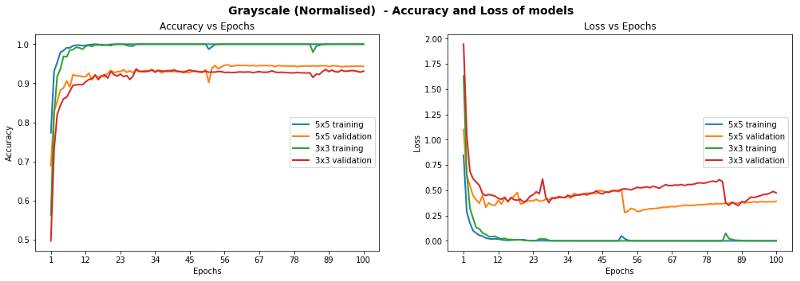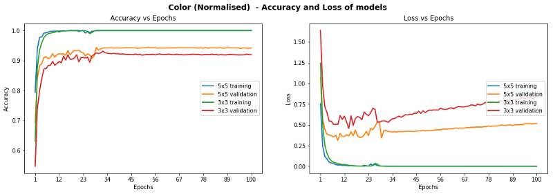 我们实际上是以卷积深度为16开始的,但在深度为32的时候获得了更好的结果并最终确定了这个值。我们还比较了彩色与灰度图像、标准和归一化的图像,最后发现灰度图往往优于彩色图。不幸的是,我们在3x3或5x5的模型上最高勉强达到了93%的测试准确率,而后来一直没有达到这个准确率。你可以在下图中看到针对不同模型配置的一些指标图。