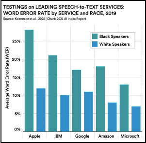 此处的示例显示了一些领先公司的语音识别程序中的错误率。研究人员测试其系统的性能时,很少测试其系统的有害偏差。