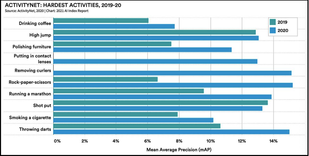 在对人类200种日常生活的调查中,图表显示人工智能系统在识别咖啡饮用这一活动时是最困难对。这似乎是一个很严重的问题,因为喝咖啡是一项非常基本的活动,所以今后需要在这个领域需要更多的研究。