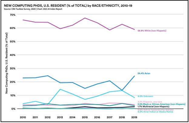 在AI系统中解决偏见和歧视的一种方法就是保证工作环境的多样性。报告指出,在学术界和工业界,从事人工智能方面工作者“仍然主要是男性,人员构成缺乏多样性”。
