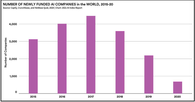 该图显示,对于AI初创公司的私人投资越来越少。尽管新冠疫情可能影响了初创企业的活动,但其实初创企业从2018年就开始下降,一直到现在都一直是下降的趋势。所以这似乎是一个行业日趋成熟的信号。