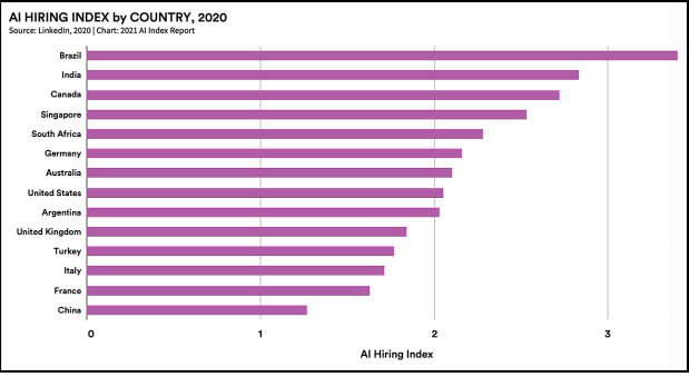 LinkedIn的数据显示,从2016年到2020年,巴西,印度,加拿大,新加坡和南非的AI招聘人数增长最快。但这并不意味着这些国家的绝对就业人数最多(美国和中国继续保持领先地位),LinkedIn发现,即使在2020年突发的新冠疫情也