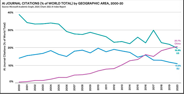 中国的研究人员在过去发表的关于人工智能的研究论文最多,在2017年就处于领先地位。截至2020年,中国学者的论文被外国学者引用的数量也是最多的。