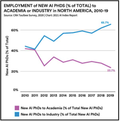 虽然大学里面增加了很多与人工智能相关的课程,也增加了终身制教职人员的数量,但是学术界仍然没有为毕业的AI博士提供更多的任职机会。
