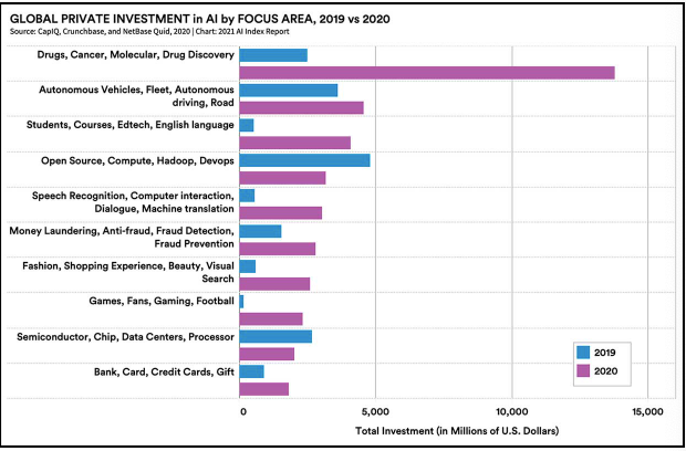 另一方面,虽然AI行业在很大程度上不受新冠疫情的影响,但该图显示2020年的私人投资向其他某些领域出现倾斜,这些领域在应对COVID-19的进程中发挥了重要作用。