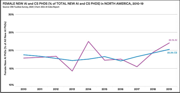 该图根据计算机研究协会的年度调查数据显示在北美AI博士毕业生中,女性仅占约20%。