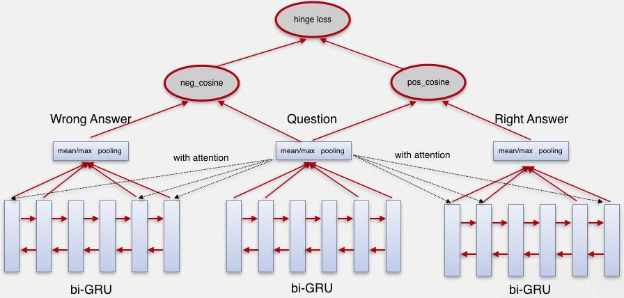 从图中可以看到,我们模型的输入是三个句子,问句、正确答案句和错误答案句,思路是利用卷积层和池化层分别对着三个句子进行卷积,学习得到相应的句子向量表示,之后再做一次隐藏层的向量维度变化,然后使用该向量进行相似度的计算,相似度使用的是余弦相似度,得到问句与答案句之间的分数,而代价函数使用的是hingeloss,目的是为了使的正确答案子得分能够领先于其他句子得分。