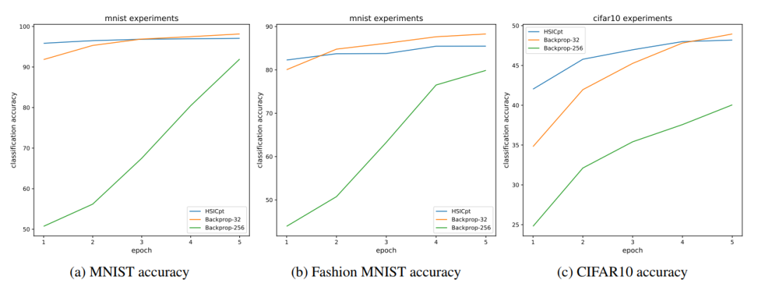 研究者表示,HSIC-Bottleneck 的表现在 MNIST/FashionMNIST/CIFAR10 分类中的表现与具有交叉熵目标函数的反向传播算法相当。
