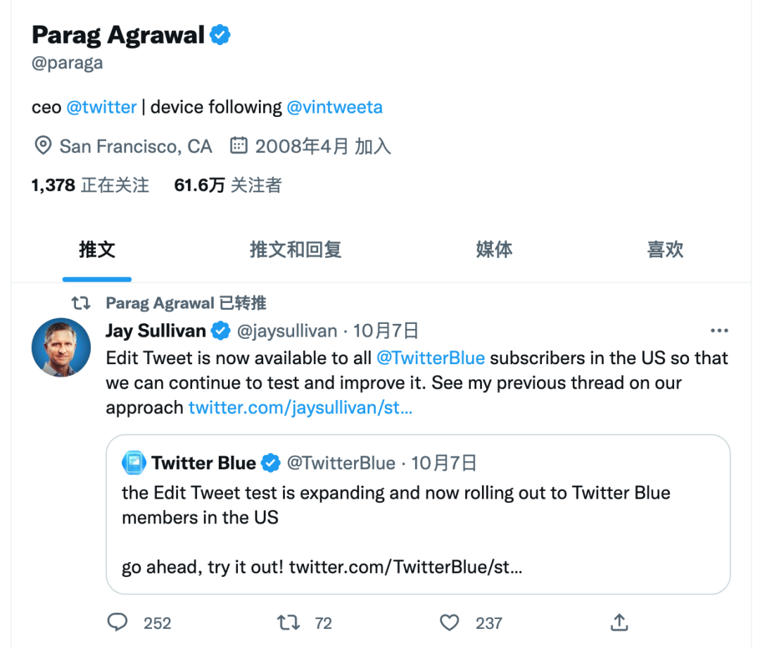 Parag Agrawal,80 后,印度裔,于 2011 年加入 Twitter 担任软件工程师, 2017 年起担任 CTO,负责 Twitter 整体技术战略,2021 年,原 Twitter CEO Jack Dorsey 卸任,Parag Agrawal 正式接棒成为 Twitter CEO。如今,马斯克刚刚买下 Twitter,Parag Agrawal 即遭解雇,然而截止目前,Parag 的 Twitter 账号简介未变,内容依然停留在 10 月 7 日转推 Twitter 功能更新的推文上。