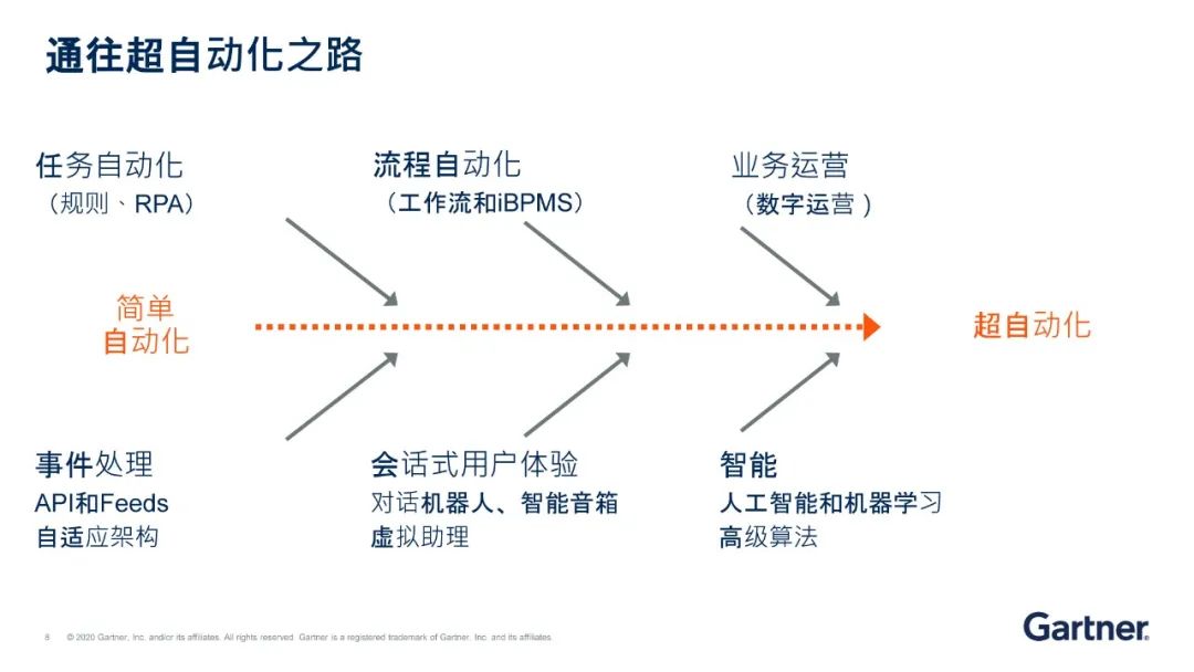 超自动化是多种机器学习(ML)、打包软件和自动化工具相结合的产物。Cearly说,超级自动化不仅涉及可用工具的广度,而且涉及自动化本身的所有步骤(发现、分析、设计、自动化、测量、监视和重新评估)。理解自动化机制的范围,它们之间的相互关系以及如何将它们组合和协调是超自动化的重点。超自动化需要多种工具的结合,以渗入到人类活动的各个部分。