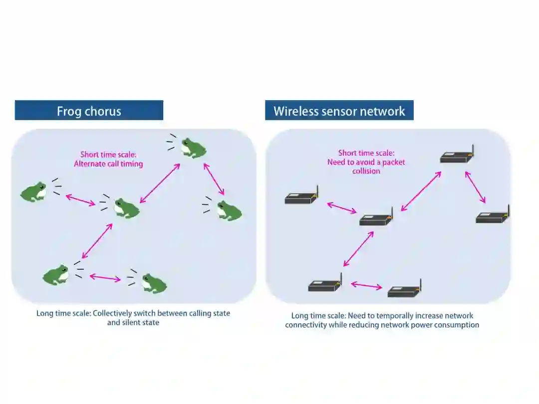 论文合著者 Daichi Kominami 解释道:“我们发现,邻近的青蛙避免了时间上的重叠,从而使得个体的声音能不受干扰地被听到。通过同样的方式,传感器网络中的邻近节点需要在时间上交替地传输数据,这样数据包就不会相互冲突。”