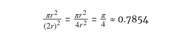 假设上图中圆的半径是r,那么正方形的边长就是2r。圆的面积是πr2,正方形的面积是(2r)2。