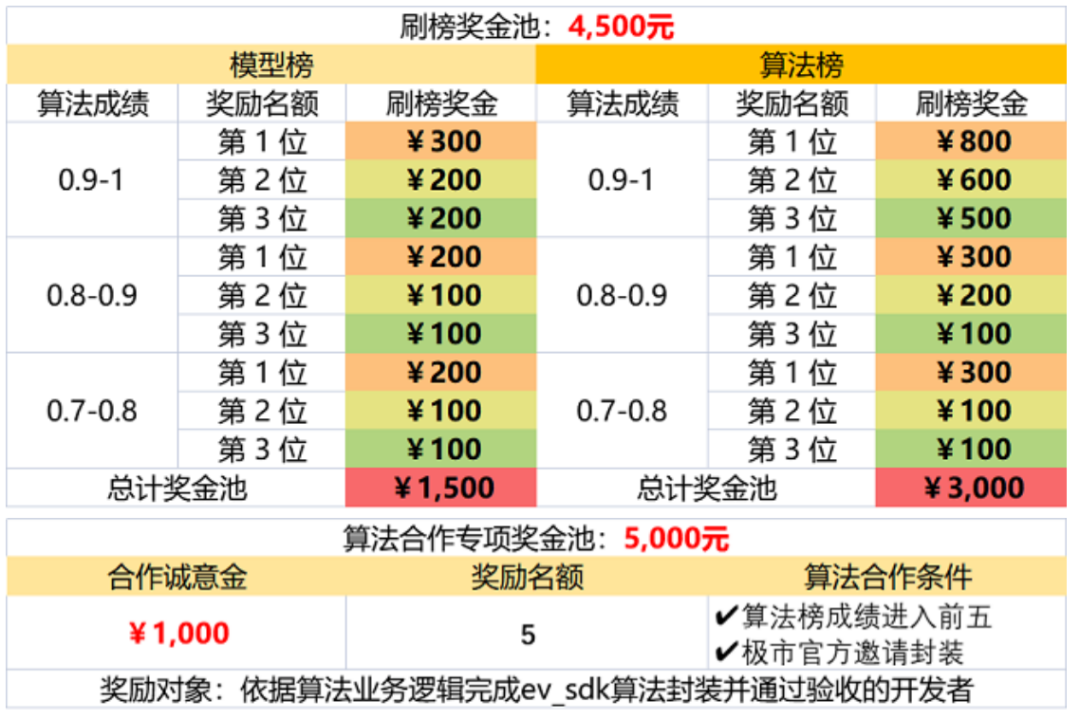 开发者报名极市打榜,可用平台上已标注真实场景数据集+免费算力,单个算法榜单完成算法开发后成绩达到指定标准便可获得定额奖励,成绩优异者可与极市平台签约合作获得长期的算法分成收益。