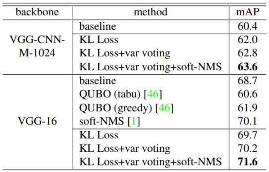 研究者基于 VGG-16 Faster R-CNN 评估了每个模块对整体结果的贡献,包括 KL 损失、soft-NMS 和方差投票。表 1 给出了详细结果。可以看到,每新增一项改进,都能实现结果的进一步提升。