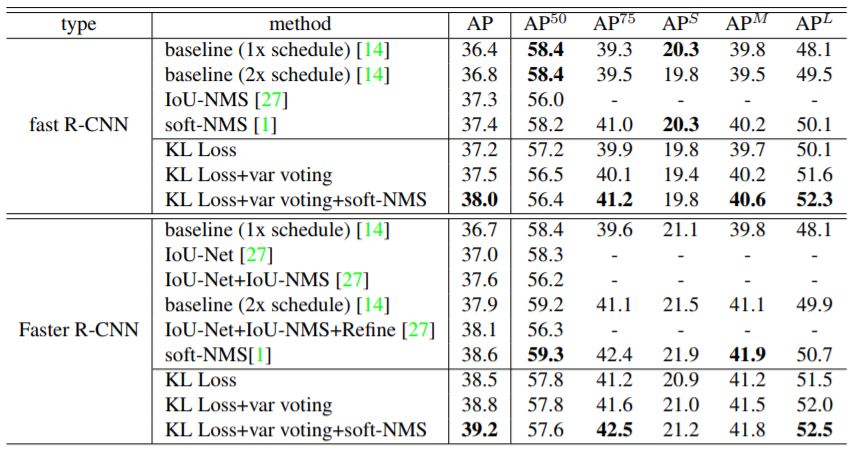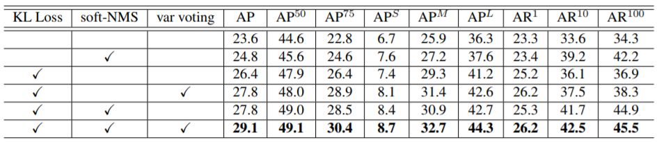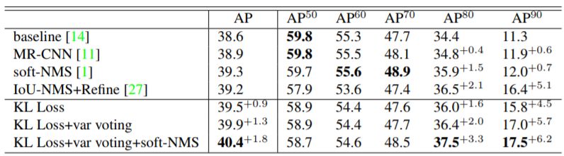 表 4 总结了在 ResNet-50-FPN Mask R-CNN 上不同方法对准确目标检测的效果。使用 KL 损失,网络可以在训练阶段学习调节模糊边界框的梯度。
