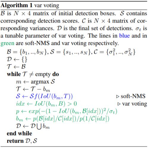 本文是在标准 NMS 或 soft-NMS 的过程中投票所选框的位置。在选择了有最大分数的检测结果后,再根据它及其邻近边界框计算它本身的新位置。本文受 soft-NMS 的启发为更近的以及有更低不确定性的边界框分配了更高的权重。