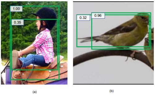 图 2:VGG-16 Faster RCNN 在 MS-COCO 上的失败案例。(a) 两个边界框都不准确;(b)有较高分类分数的边界框的左边界是不准确的。