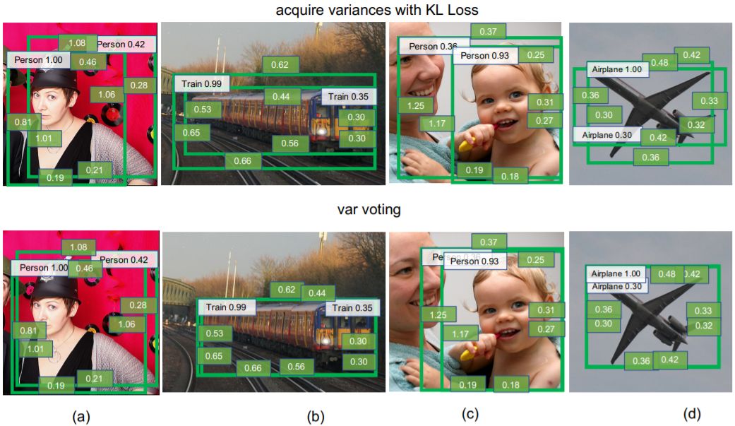 所学习到的方差可用于后处理阶段。研究者提出了方差投票(variance voting)方法,可在非极大值抑制(NMS)期间使用由预测的方差加权的临近位置来投票得到边界框的位置。