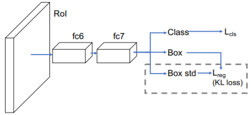 图 3:本文提出的用于估计定位置信度的网络架构。不同于两级式检测网络的标准 Fast R-CNN head,这个架构是估计边界框位置以及标准差,这会在新提出的 KL 损失得到考虑。