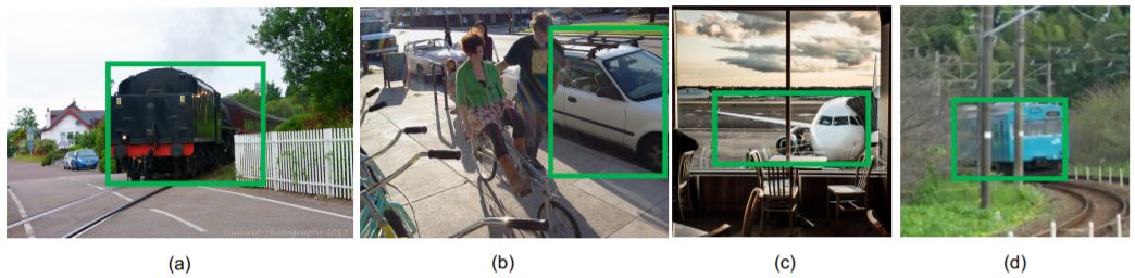 图 1:边界框标注模糊的示例。(a,c) 是标注不准确,(b) 是存在遮挡,(d) 则是因为遮挡导致目标边界框本身并不清晰