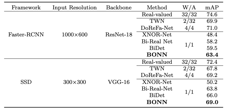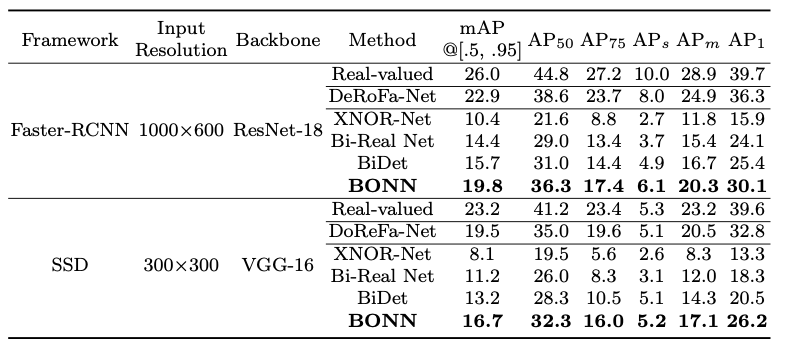 在目标检测任务上,在基于ResNet-18骨架网络的Faster-RCNN检测器上,BONN分别在PASCAL VOC与COCO数据集上取得了63.4%与19.8%的mAP;在基于VGG-16骨架网络的SSD检测器上,BONN分别在PASCAL VOC与COCO数据集上取得了69.0%与16.7%的mAP,均为行业领先。