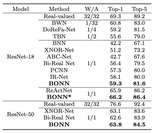 在图像分类任务上,基于ImageNet数据集,我们在ResNet-18/50、MobileNet骨架网络上验证了BONN的有效性。如表1所示,我们达到了新的行业领先效果。特别的,我们的BONN* 将预先训练的ReActNet在Top-1精度方面提高了0.3% (Top-1 66.2%)。然而,ReActNet没有从预先训练的权重中获得任何改进。