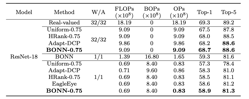 在剪枝任务上,我们先运用主成分分析,验证了我们的高斯分布假设(图3)。如表5所示,在ImageNet数据集上,BONN剪枝方法对全精度ResNet-18模型与1比特ResNet-18模型能达到较好的效果。