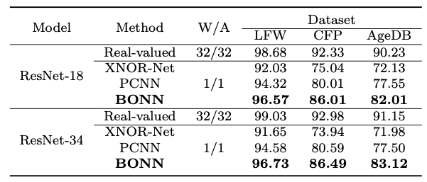 在人脸识别任务上,BONN在LFW、CFP、AgeDB数据集上取得了最优的效果,领先于XNOR-Net与PCNN。