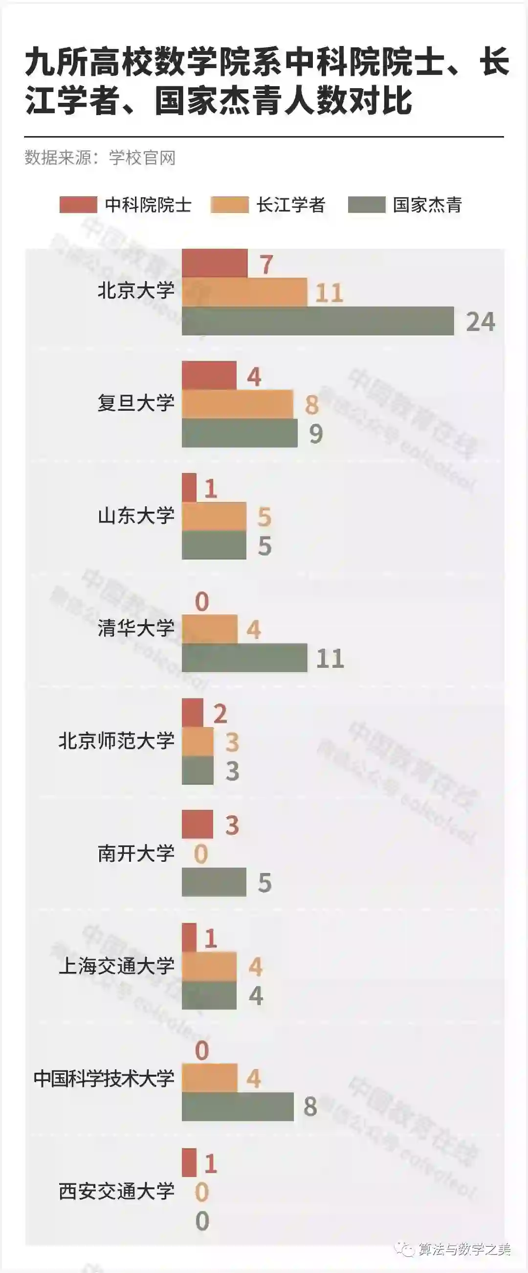从中科院院士、长江学者、国家杰青人数对比来看,北京大学数学学院遥遥领先,拥有一支高素质、高水平、实力雄厚的师资队伍。