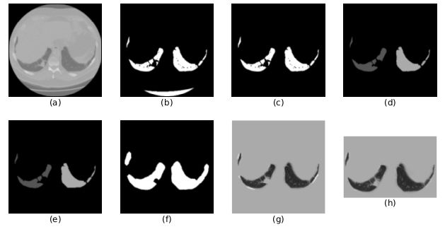 掩膜提取:在2D切片上,首先使用标准差为1的高斯滤波和阈值为-600的处理得到肺部以及周围较暗部分的掩膜,如上图b所示,然后进行连通性分析去除小于30mm2的connected component和离心率大于0.99的部分(some high-luminance radial imaging noise),再计算得到二值的3D矩阵中所有的3D connected component,且仅保留非边缘部分(用于去除肺部周围较暗的部分)以及体积在0.68~7.5L之间的部分,结果如上图c所示;