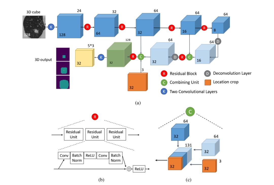 但目前大多数的研究主要集中于第一步,以及通过肺结节诊断肺癌存在较高的假阳性率。因此,肺癌的诊断需要对每个可疑结节进行细致分析,再联合所有结节信息进行定性诊断。针对上述问题,本文提出了一个三维深度神经网络(3D deep neural network)用于解决这些问题。该网络由两部分组成:
