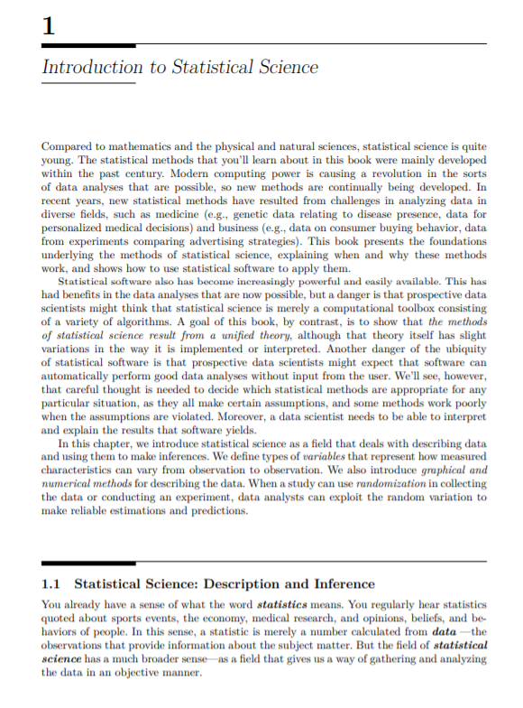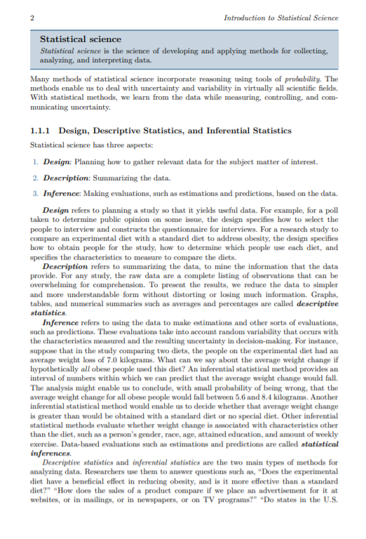 《数据科学家的统计基础:使用R和Python》是一本一学期或两学期的数学统计入门教材,供培养成为数据科学家的学生使用。它深入介绍了任何数据科学家都应该熟悉的统计科学主题,包括概率分布、描述性和推理统计方法以及线性建模。这本书假设有基本的微积分知识,所以演示可以集中在“为什么它可以工作”以及“如何做它”上。然而,与传统的“数理统计”教科书相比,这本书较少强调概率论,而更强调使用软件来实现统计方法和进行模拟来说明关键概念。书中所有的统计分析都使用R软件,还有一个附录展示了用Python进行的相同分析。