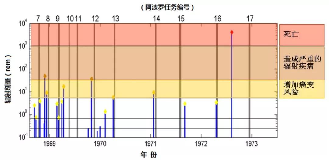 图4 阿波罗任务期发生的太阳质子事件,蓝色线条表示质子事件发生的时间,蓝色线条的长度表示这次事件可能造成的辐射剂量,灰色线条表示各任务飞行在轨时间(图片来自网络)