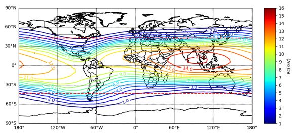 图1 2015年400km高度上的地磁垂直截止刚度(Tsy89-Boberg,Dst=-300)红色虚线之间为天宫二号轨道范围