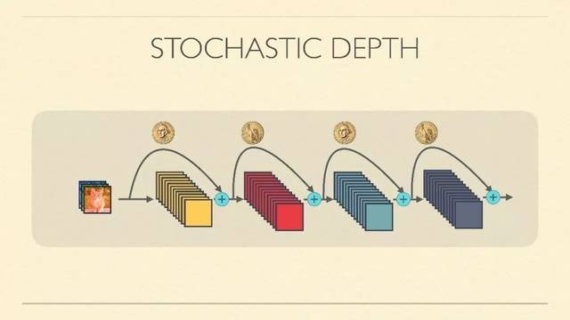 方法:在训练的每一个iteration前,在resnet的每一个Residual Unit上,我们只需随机扔一枚硬币,判定这个Unit是否被消去(去除非线性stack只保留直连)。最后再做前向和后向的传播。这样,我们每一次都相当于在训一个浅一点的网络,最后这个大网络也能收敛,效果不错。