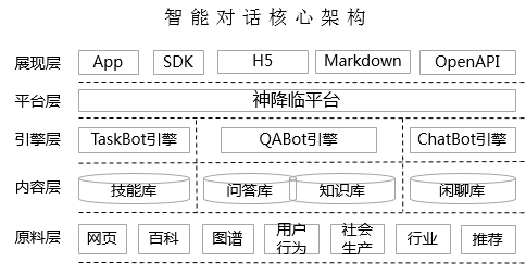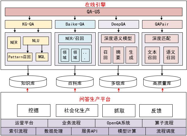 QABot引擎:包括KG-QA引擎、QAPair引擎、DeepQA引擎。KG-QA主要是百科和围绕全网知识图谱的精准问答;QAPair引擎以问答对生产消费为主;DeepQA引擎基于url索引、分类聚类、焦点词、摘要的多级系统