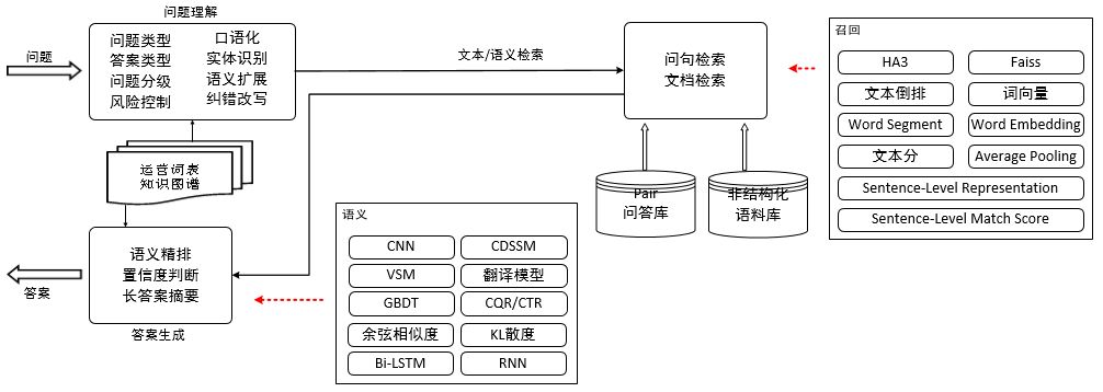 基于检索端的候选答案,需要通过进一步的精排、答案抽取、置信度计算,最终得到准确、简洁的答案。PairQA,更多的是通过CNN、DSSM、GBDT等机器学习模型和方法做严格的排序 + 置信度计算;DeepQA,面向的是非结构化的文档/社区语料,则需要做更深层次的处理,包括结合Bi-LSTM RNN模型的简洁摘要抽取、同义问题答案间交叉验证、答案相关性验证等。