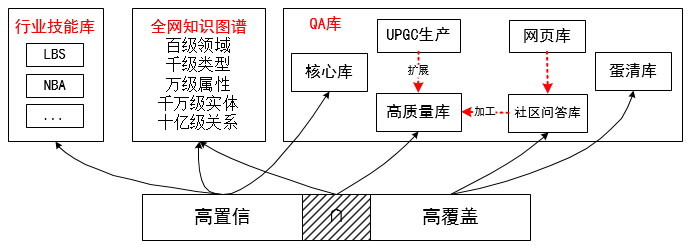 高质量库:社区问答库覆盖高但质量参差不齐,社会化生产质量高但数量相对较少,通过机器对社区问答库的清洗和对社会化生产库的扩展,最终沉淀成高质量库;