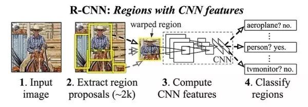 在OverFeat提出不就,伯克利大学的Ross Girshick等人就提出了RCNN(基于区域的卷积特征)[9],它在目标检测比赛上相比其他方法取得了50%的性能提升。他们提出了一个三阶的方法: