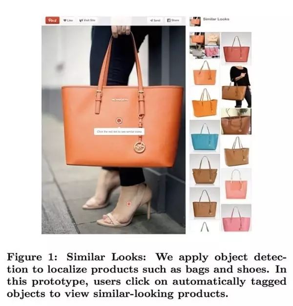 相似图像:我们应用目标检测技术来定位包或者鞋子这种产品。在这个例子中,用户点击自动标注好的物体去查看相似的产品。(Pinterest论文中的例子)