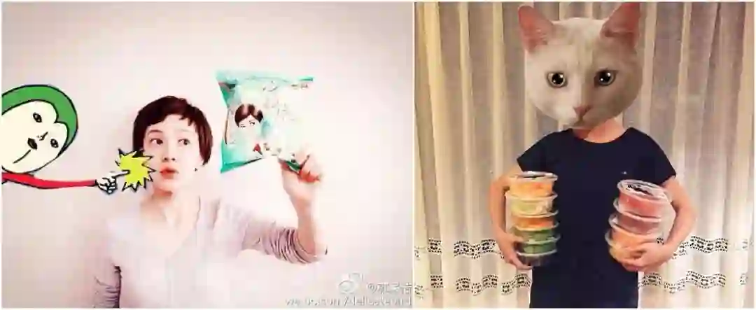 Catwang 和柏林少女就是她使用的 app,它们功能单一,专门为你的照片加上各类画风清奇的贴纸。Catwang 的贴纸偏向于搞怪风格,除了郭采洁照片中的猫头,app 内还有披萨、怪物、符号以及各类生活小物品的贴纸,非常值得玩味。